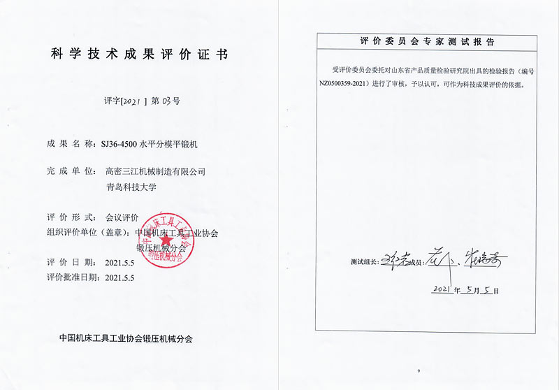 此次,三江同步拿到中国机床锻压协会专项技术鉴定报告,以及山东省质量检测院检测报告,意味着三江机械研制的SJD11系列新型水平分模平锻机,已处于国内领先水平,填补了多项国内技术空白。SJD11系列平锻机结构先进、刚性强、速度快、质量稳定,各项关键指标都从专利、著作权、实测数据等各方面进行了充分证明,经过了专家组的严密审核和鉴定,最终得到了各方评委的一致认可。