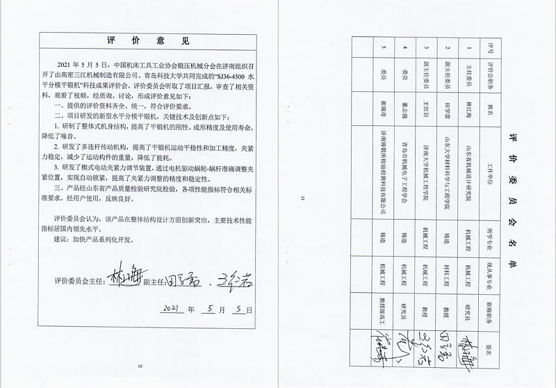 2021年5月12日,三江机械研发小组在济南参加首台套现场答辩,450T新型平锻机顺利通过首台套技术鉴定。
